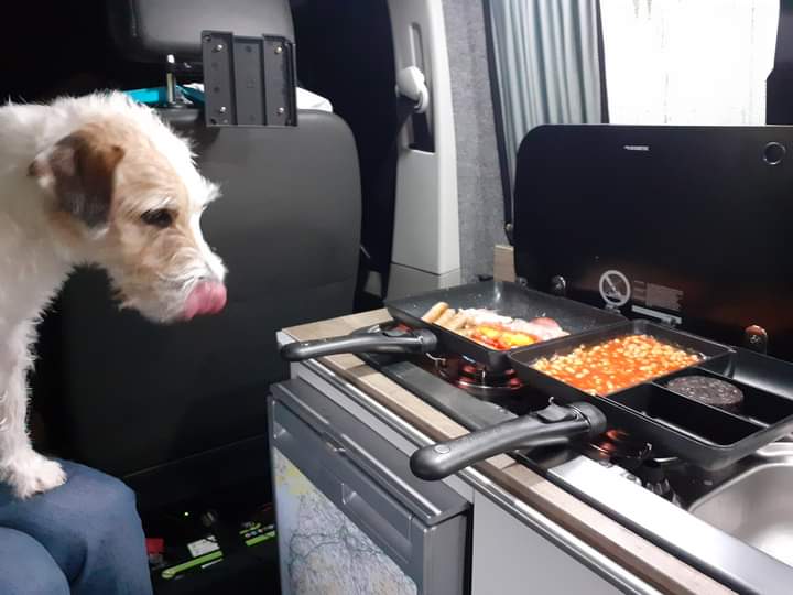 2. Please do not tie your pooch on a lead in the van and better still never tie them to the leg of the table as we once found when Monty saw a squirrel and he ended up covered up in a fry up and breakfast was no longer 🙂