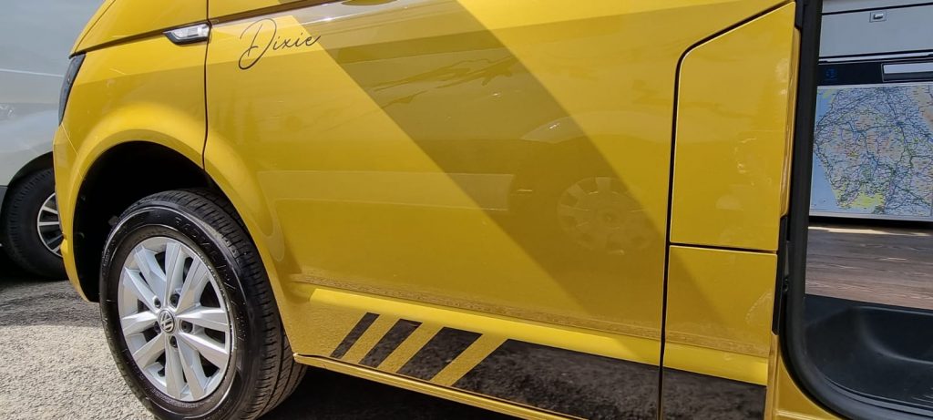 We bought her back in March from Surrey after deciding Dolly needed a pal and demand was going through the roof with a boom in Staycations. As with Dolly we wanted a van we could personally be involved in and give the ‘New Kid on the Block’ a personality of her own. It wasn’t going to be too difficult to make her shine with her bright Metallic paintwork.